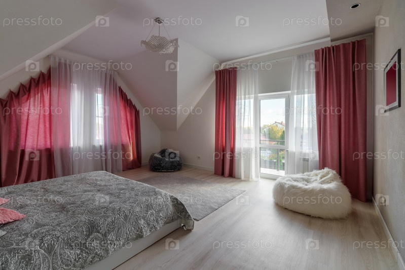 Красивый дизайн интерьера современной и уютной спальни с розовыми подушками и шторами