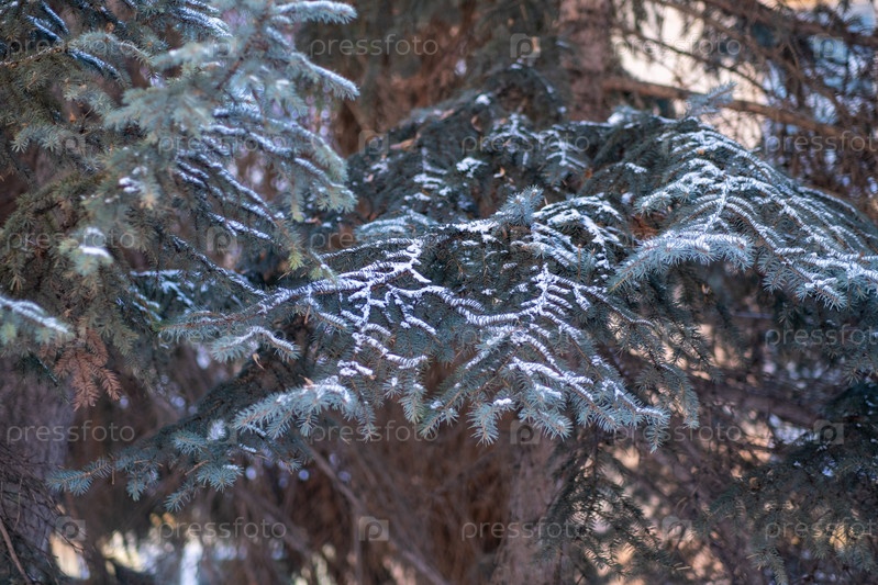 Снег на ветках елки лежит тонкой полосой. Фото высокого качества