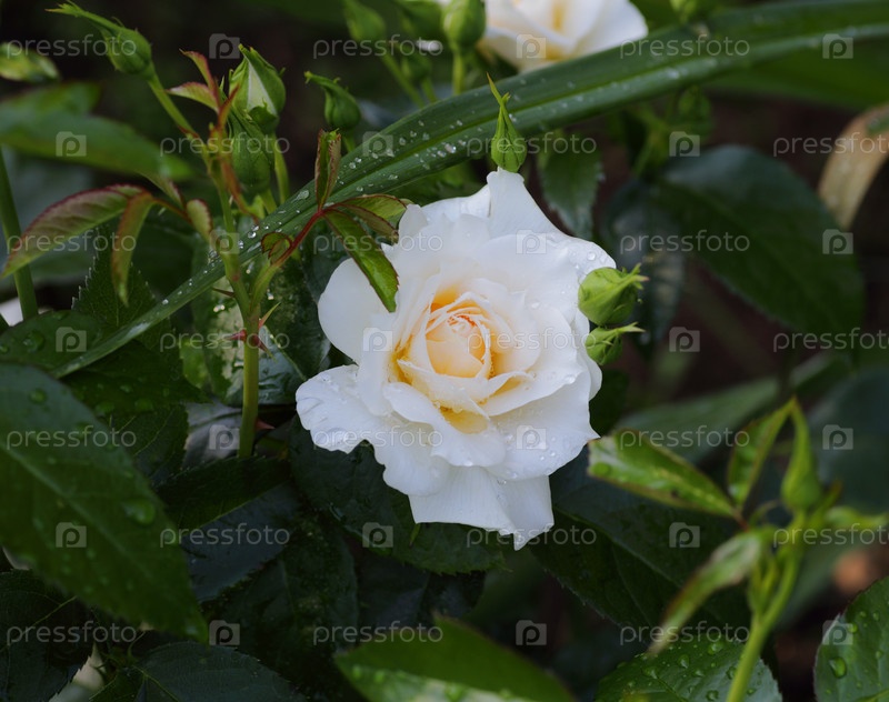 Роза с каплями росы и бутонами на фоне зеленых листьев