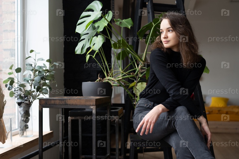 Молодая красивая женщина сидит на стуле в черном свитере возле окна