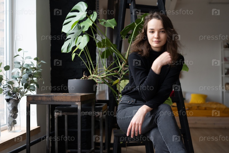 Молодая красивая женщина сидит на стуле в черном свитере возле окна