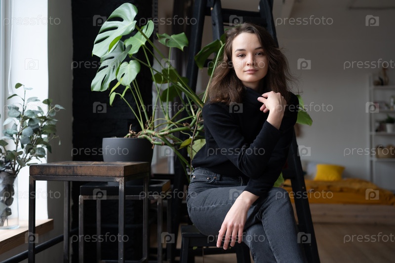 Молодая красивая женщина сидит на стуле в черном свитере возле окна