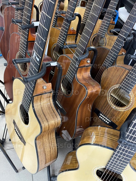 Несколько коричневых гитар стоят вместе