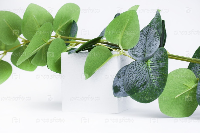 Фон с зеленой веткой, лежащей на белом кубе. Абстракция. Копировать пространство