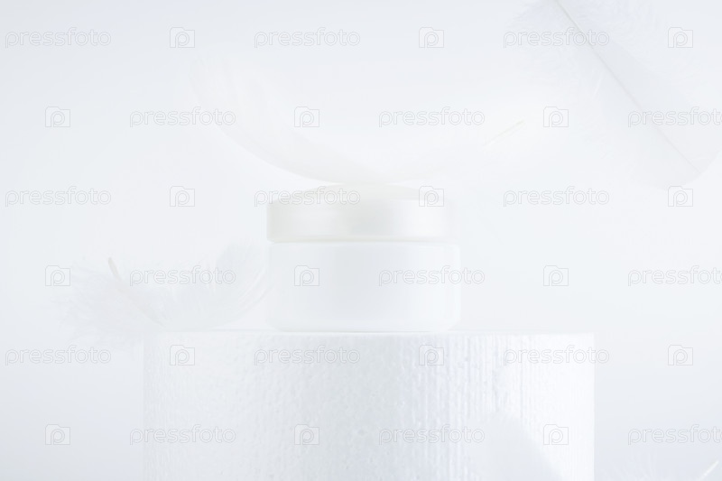 Пустой контейнер белая косметическая банка на подиуме, на белом фоне с перьями. Косметология или концепция ухода за кожей. Копировать пространство