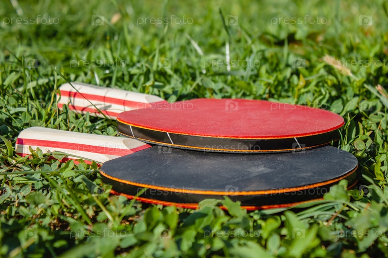 Две ракетки для настольного тенниса, красная и черная, лежат на траве. Крупный план