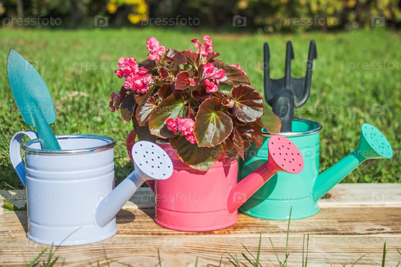 Разноцветные декоративные лейки с цветком бегонии и садовым инструментом стоят на досках в саду