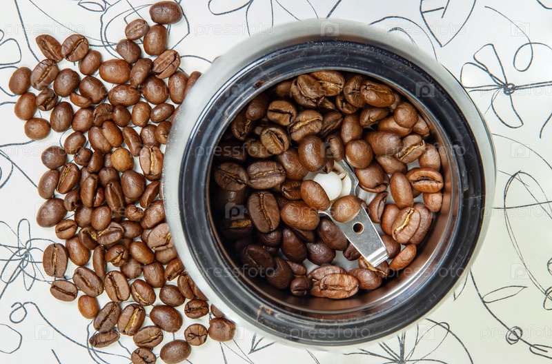 Электрическая кофемолка со свежеобжаренными кофейными зернами на фоне горсти кофейных зерен на столе