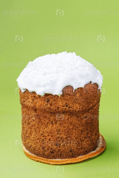 Пасхальный кулич с сухофруктами, изюмом под белой сахарной глазурью с кокосом, изолированный на зеленом фоне. Концепция выпечки, традиционные пасхальные угощения. Копировать пространство