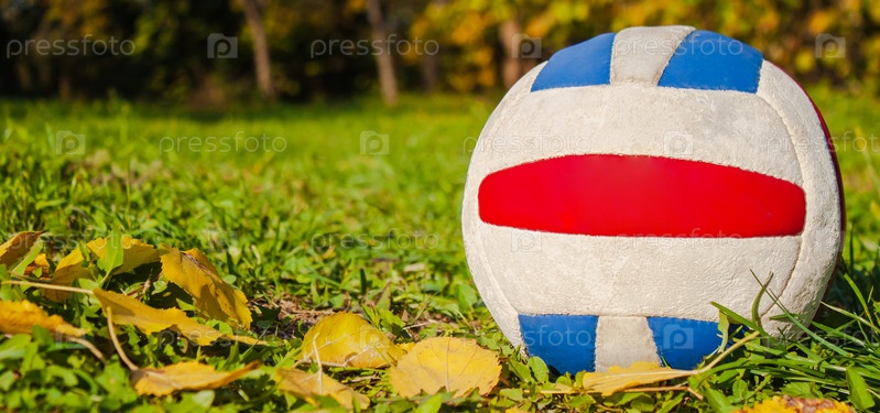 Старый волейбольный мяч лежит на зеленой траве и листве крупным планом. Пустое место для текста