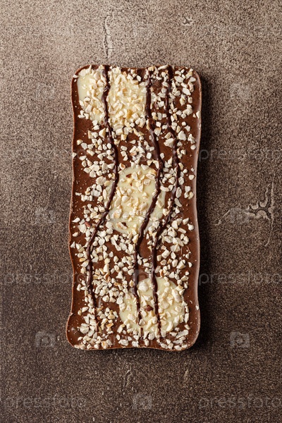 Вид сверху на шоколадную плитку из трех видов шоколада и дробленого фундука на коричневом фоне крупным планом