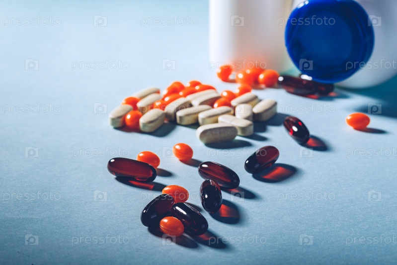 Закройте таблетки на синем фоне, вид сверху Медицина Здравоохранение Аптека ConcepAnti-Virus Медицинские принадлежности Концепция смертельной эпидемии коронавируса