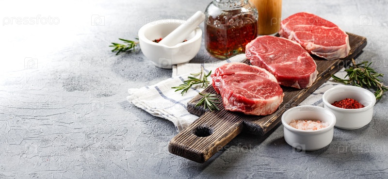 Три куска традиционного тонкого стейка, вырезанного из вырезки на деревянной разделочной доске. Стейки из сырого мяса Блэк Ангус Прайм подходят для приготовления на гриле или на сковороде. Длинный широкий баннер