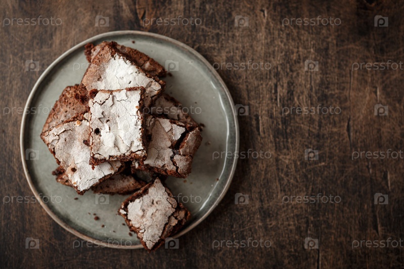 Ломтики Домашние пирожные с темным шоколадом, посыпанные сахарной пудрой на темном фоне. Вид сверху. Место для текста