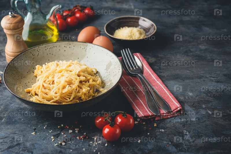 Паста Лингвини с яичницей и сыром пармезан. Традиционная итальянская кухня. Место для текста