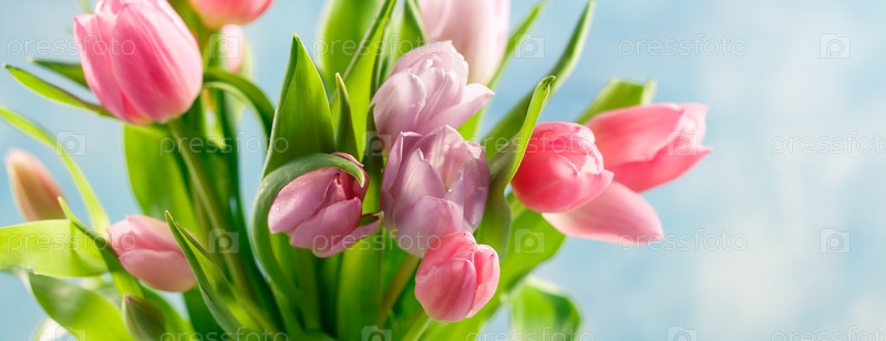 Букет розовых и сиреневых тюльпанов в стеклянной вазе на синем фоне. Длинный широкий баннер