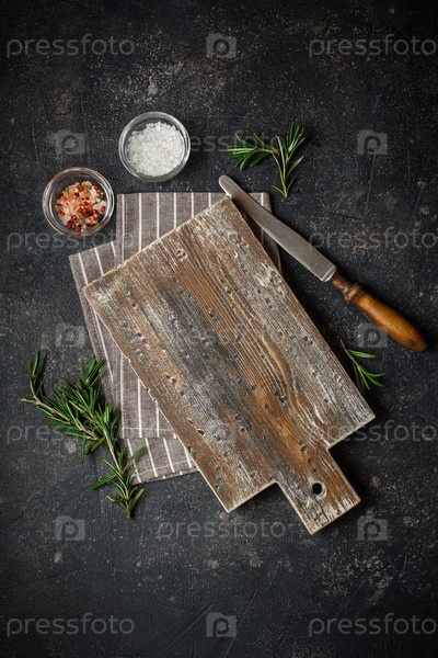 Деревянная разделочная доска, розмарин, соль, перец горошком, салфетка и нож на темном фоне. Вид сверху, скопируйте место для текста. Меню, макет рецепта, фон баннера