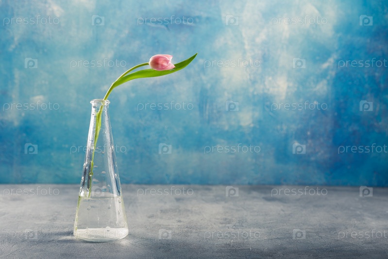 Букет розовых и сиреневых тюльпанов в стеклянной вазе на синем фоне. Свободное место для текста