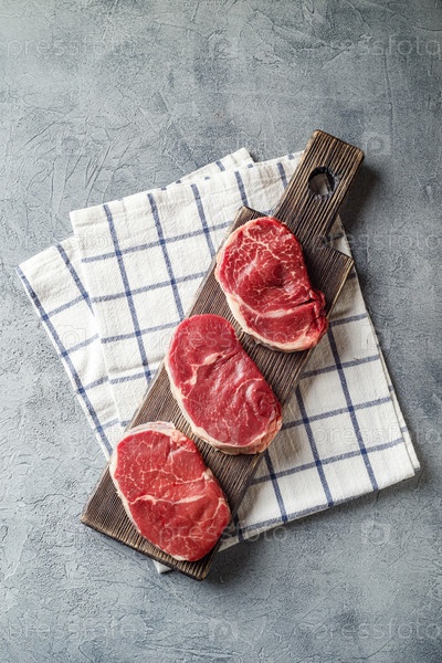 Три куска традиционного тонкого стейка, вырезанного из вырезки на деревянной разделочной доске. Стейк имеет хорошую мраморность, красивую ровную форму и нежную структуру мяса, подходит для гриля или сковороды. Вид сверху