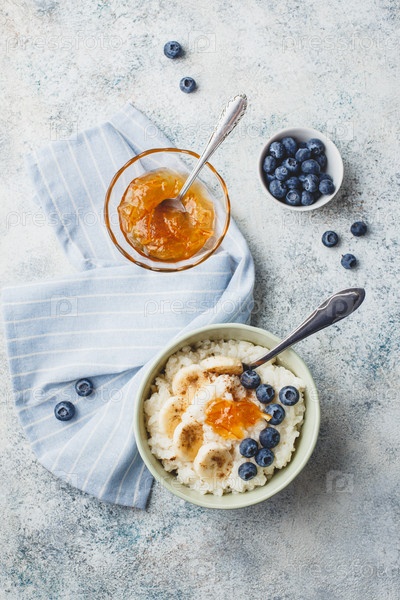 Завтрак с молочной рисовой кашей с бананами, черничным и апельсиновым джемом, сливочным рисовым пудингом или французским рисом с молоком в миске
