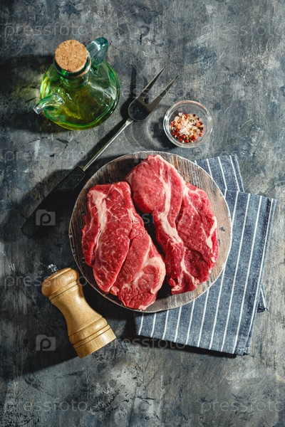 Два свежих сырых стейка Prime Black Angus Chuck на деревянной разделочной доске на сером фоне