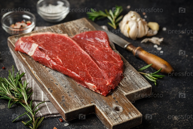 Сырой свежий стейк подается с розмарином, чесноком и специями на деревянной разделочной доске. Мясо говядины Блэк Ангус