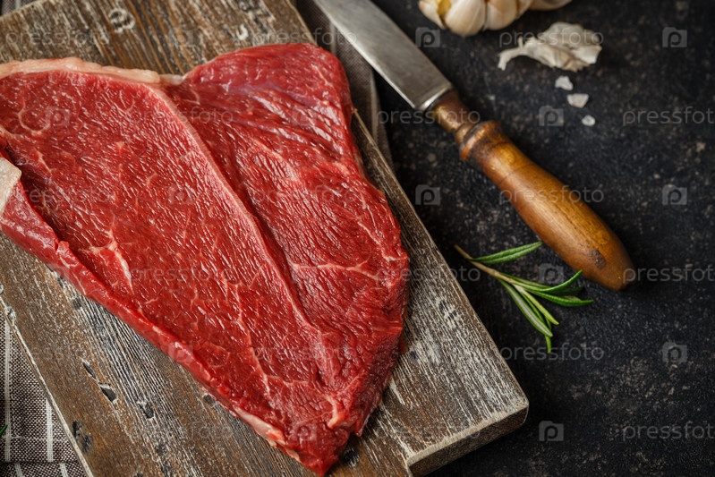 Сырой свежий стейк подается с розмарином, чесноком и специями на деревянной разделочной доске. Мясо говядины Блэк Ангус. Закрыть