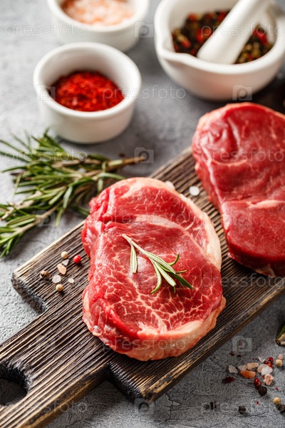 Три куска традиционного тонкого стейка, вырезанного из вырезки на деревянной разделочной доске с оливковым маслом, солью, розмарином и перцем. Стейки из сырого мяса Блэк Ангус Прайм для приготовления на гриле или на сковороде. Крупным планом