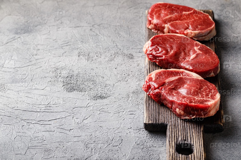 Три куска традиционного тонкого стейка, вырезанного из вырезки на деревянной разделочной доске. Стейк имеет хорошую мраморность, красивую ровную форму и нежную структуру мяса для гриля или сковороды