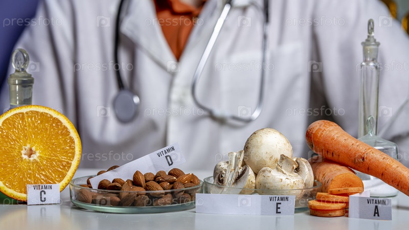 Апельсины, грибы, орехи и морковь на лабораторном столе с названиями витаминов. Необходимые витамины. Пищевой лаборант