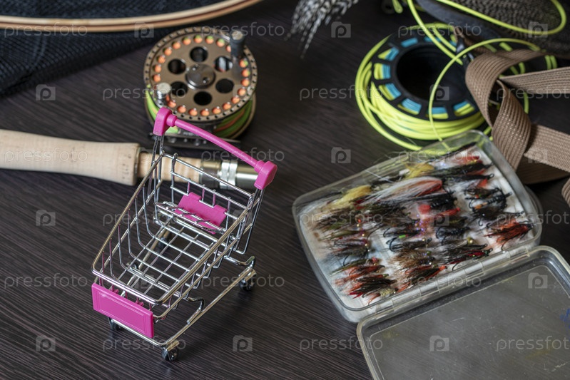 Концепция покупок нахлыстом. Удочка, нахлыстовая коробка, нахлыстовая катушка с леской в мини-тележке