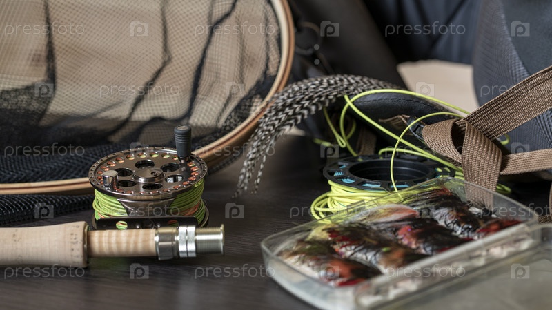 Удочка, катушка и винтажный лосось летят в коробках на проблемном деревянном фоне