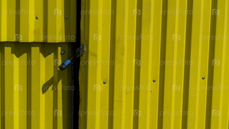 Желтая закрытая спиральная дверь ангара. Желтая сталь, текстура двери с линиями