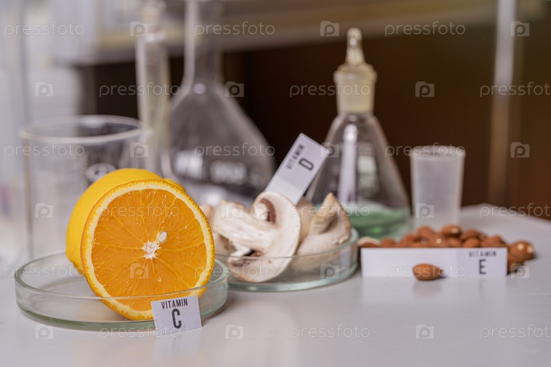 Апельсины, грибы и орехи на лабораторном столе с названиями витаминов. Необходимые витамины. Пищевая лаборатория