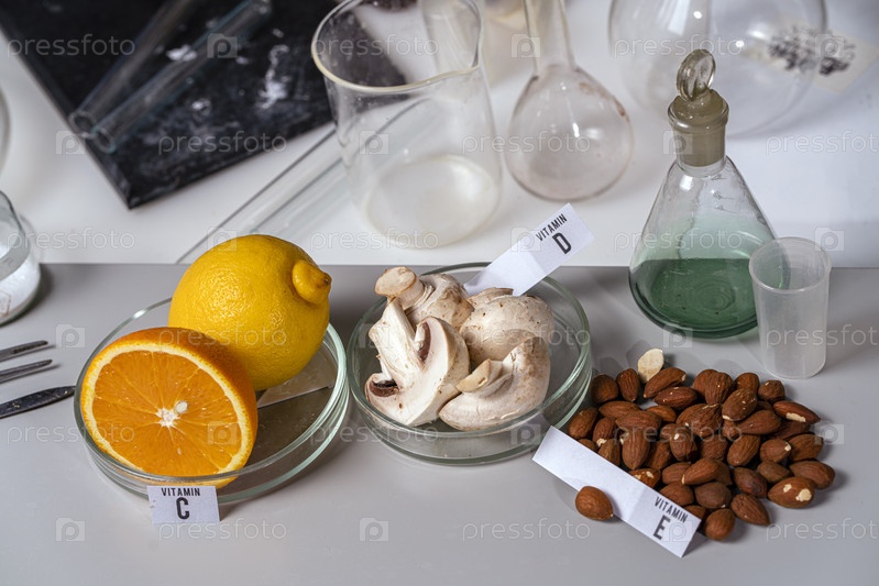 Апельсины, грибы и орехи на лабораторном столе с названиями витаминов. Необходимые витамины. Пищевая лаборатория