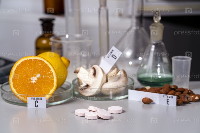 Таблетки и апельсины, грибы и орехи на лабораторном столе с названиями витаминов. Необходимые витамины. Пищевая лаборатория