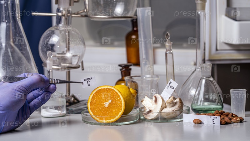 Апельсины, грибы и орехи на лабораторном столе с названиями витаминов. Рука лаборанта держит надпись витамины С. Пищевая лаборатория