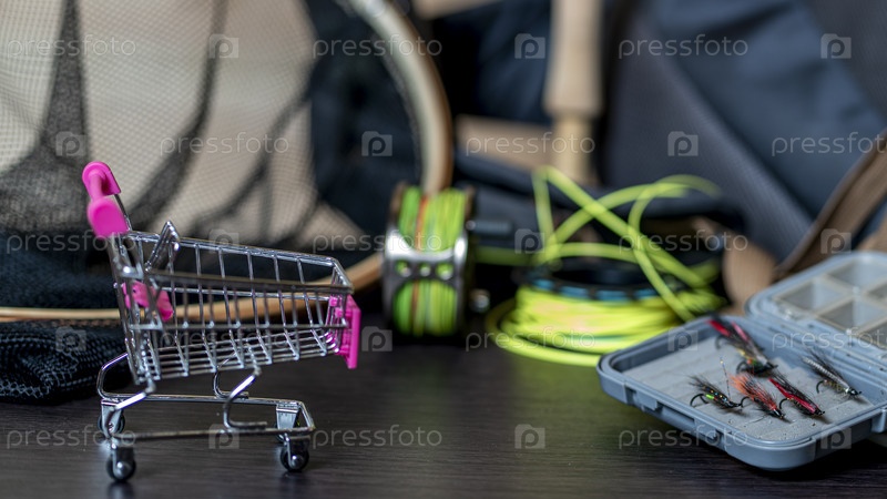 Концепция покупок нахлыстом. Удочка, нахлыстовая коробка, нахлыстовая катушка с леской в мини-тележке