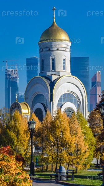 Парк Победы на Поклонной горе в Москве, Россия. Храм Святого великомученика Георгия Победоносца