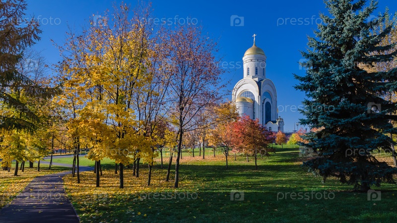 Парк Победы на Поклонной горе в Москве, Россия. Храм Святого великомученика Георгия Победоносца