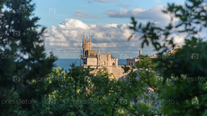 Замок Ласточкино гнездо на скале над Черным морем крупным планом, Крым, Ялта. Одна из самых популярных туристических достопримечательностей Крыма