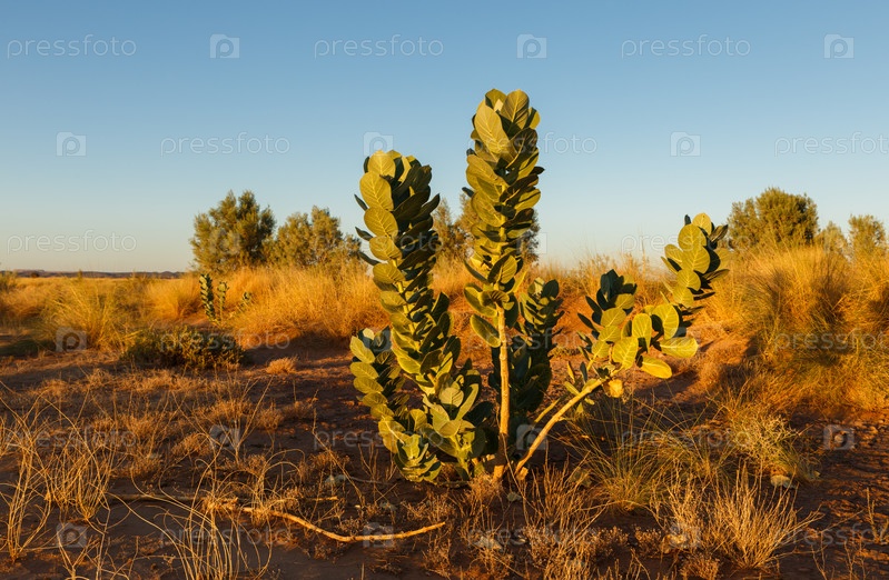 На фоне голубого неба зеленый кустарник в пустыне Сахара