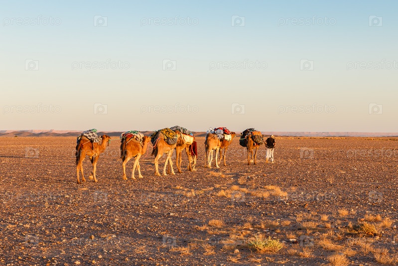 Караван верблюдов, проходящий через пустыню Сахара на закате, Марокко