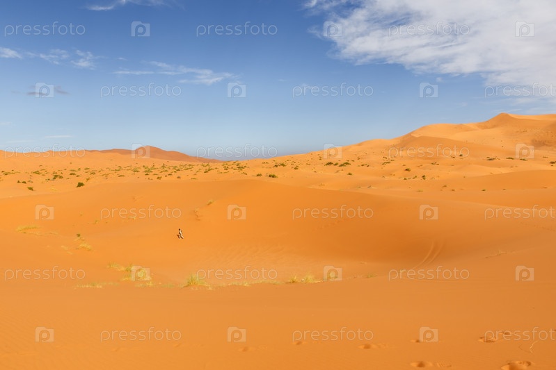 Песчаные дюны в пустыне Сахара. одинокий человек ходит по песку. Эрг Чебби. Марокко, Африка