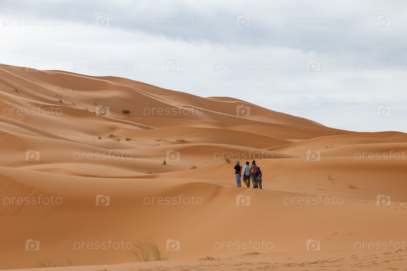 Группа людей гуляет по песчаным дюнам в пустыне Сахара. Марокко