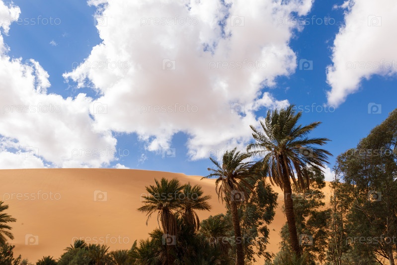 Пальмы на фоне дюны эрг-шеби, пустыня сахар, марокко