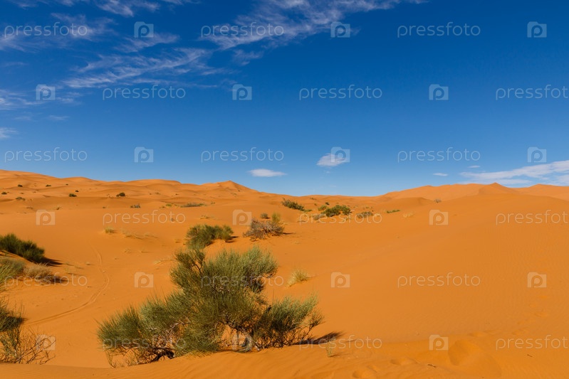 Маленький зеленый куст, растущий на песке в пустыне Сахара Марокко