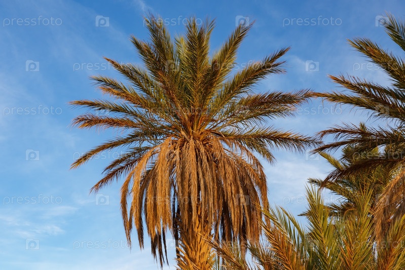 Пальма в пустыне Сахара. Зеленые ветки на фоне голубого неба