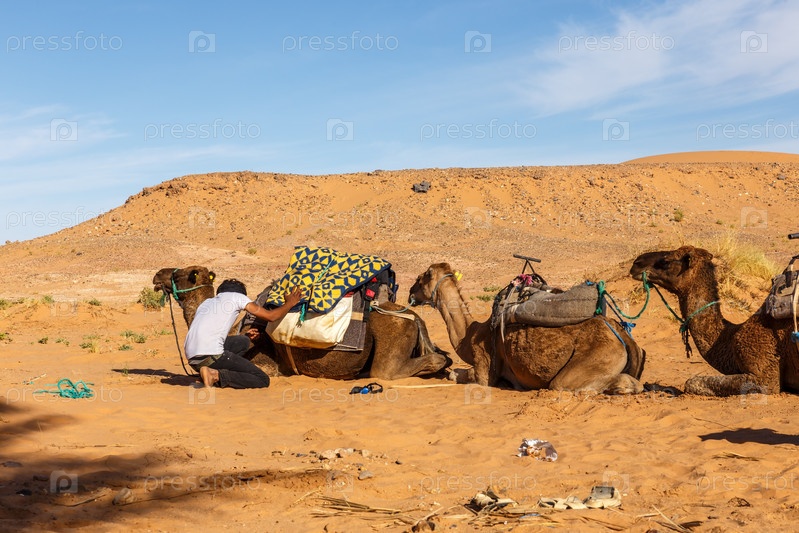 Берберский кочевник загружает багаж на верблюда. Караван верблюдов готовится к путешествию