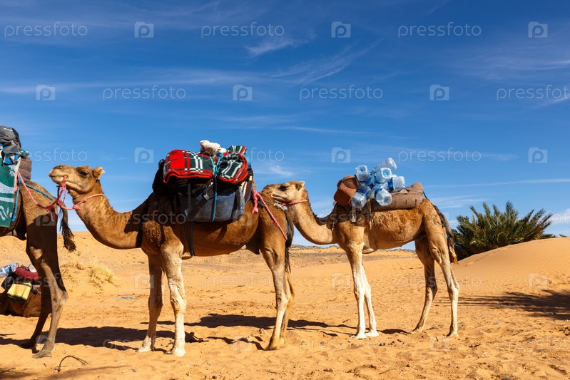 Верблюды стоят с грузом, пустыня Сахара, Марокко